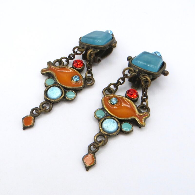 Costume drop earrings decorated with enamel and glass stones. Signed on reverse: Franck Herval, Made in France. Clip-on earrings.